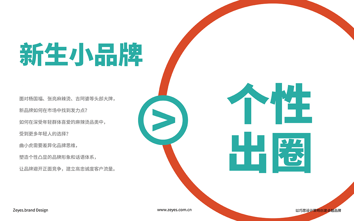 面對(duì)楊國福、張亮麻辣燙、吉阿婆等頭部大牌, 新品牌如何在市場(chǎng)中找到發(fā)力點(diǎn)? 如何在深受年輕群體喜愛的麻辣燙品類中, 受到更多年輕人的選擇? 曲小虎需要差異化品牌思維, 塑造個(gè)性凸顯的品牌形象和話語體系, 讓品牌避開正面競(jìng)爭(zhēng),建立高忠誠度客戶流量。